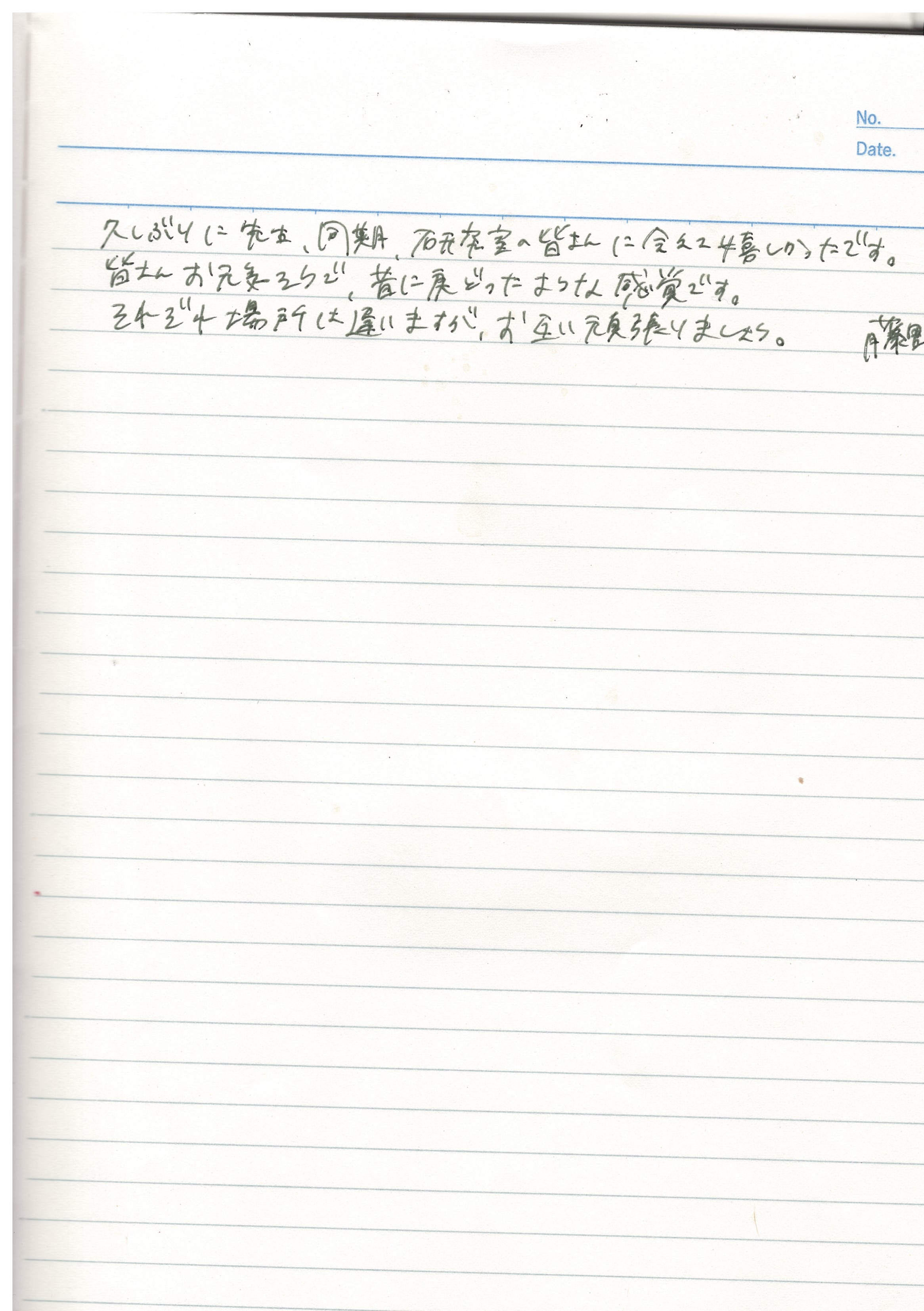 | 第12回同窓会を京都駅前の龍馬でしました。お昼間の大学祭に来てくれた人もたくさんいました。東京、岡山、長野、福井など遠くから来てくれた人もいました。中杉君はお昼間だけでしたけど久しぶりでしたね。岸君も元気そうで。他のメンバーも変わらず仕事をがんばってるようですが、無理せず続けてください。 今回は連絡網の不備で参加者が少なかったようですが、次回はたくさんの卒業生が来てもらえるよう連絡をしっかりとしたいと思います。 (卒業生のコメント) 宮内:半年ぶりに研究室を訪れましたが、変わらないようで安心しました。卒業に向けて忙しい時期になっていくと思いますが研究頑張ってください。 川本:一週間ぶりに来ましたがみんなお変わりないようでよかったです。風邪には気を付けて研究頑張ってください。 田村:1年ぶりに研究室に訪れました。模擬店と研究室公開を頑張っている姿をみて懐かしく感じました。研究の方も頑張ってくれればと思いました。 西岡:卒業後も何度か訪れていますが、変わらないなと思いました。 藤野:久しぶりに研究室に訪れましたが、皆さんお元気そうでよかったです。模擬店や研究室に訪れ、懐かしく思いました。研究で忙しいと思いますが、学生生活を楽しんでください。応援しています。 折内:中沖先生ともども皆さん元気そうでよかったです。研究室独特の雰囲気も味わえて懐かしい気持ちになりました。また機会があればお邪魔したいと思います。 永濱:研究室を久しぶりに訪問しましたが、自分がいた感じと変わらなく懐かしく感じました。 |
